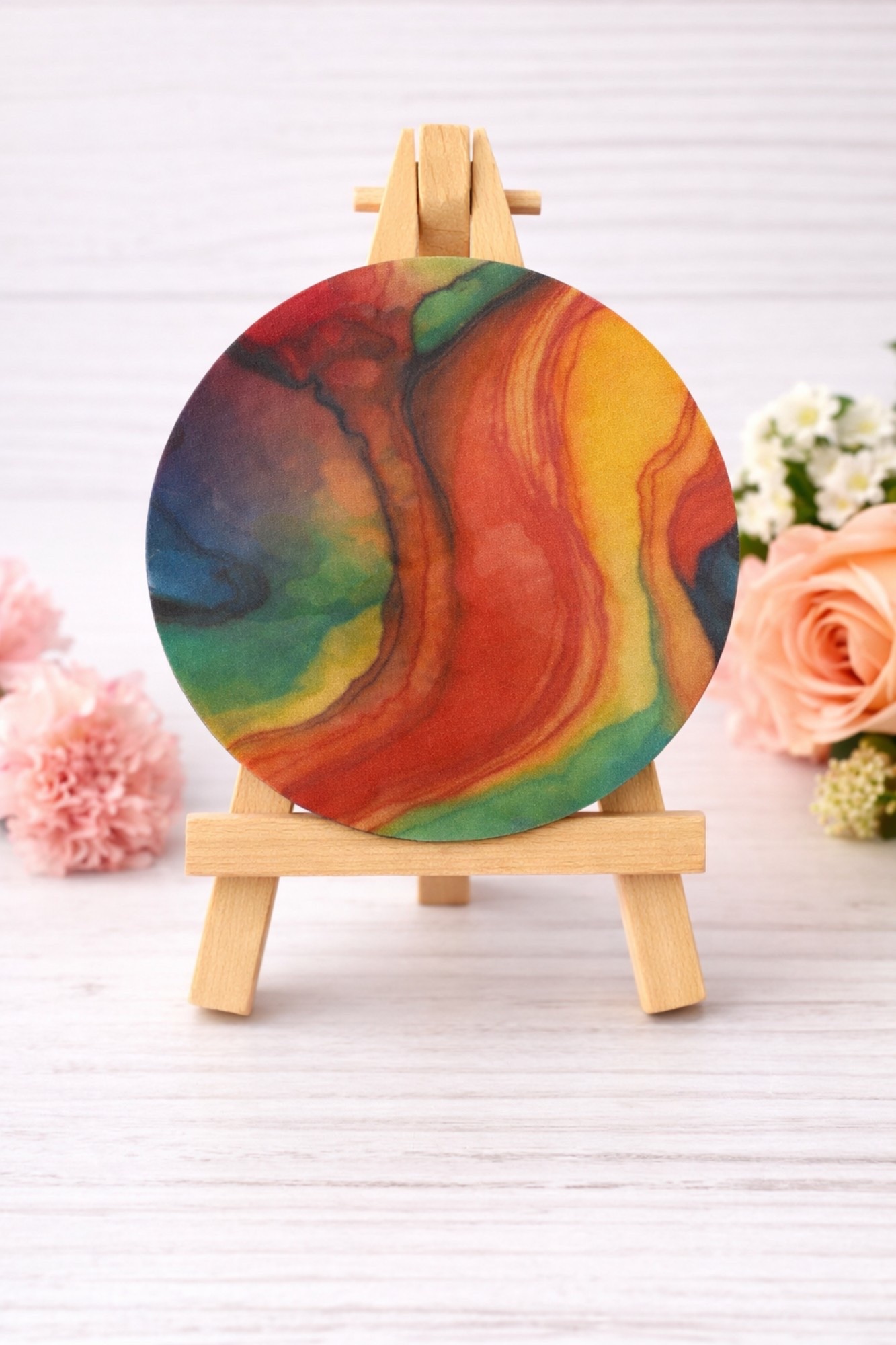 The Abstract Rainbow Swirl car coaster features rich, flowing layers of vibrant color blended into a smooth, artistic pattern. Each swirl creates a unique, eye-catching look that adds personality and creativity to your vehicle.